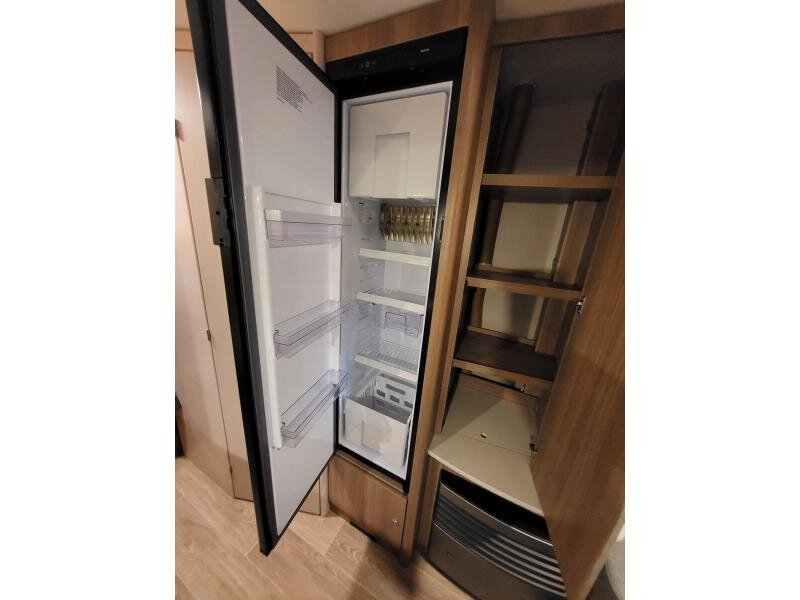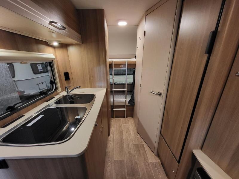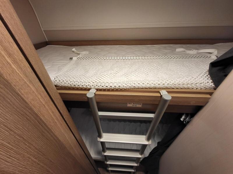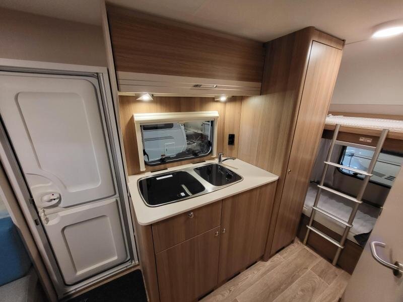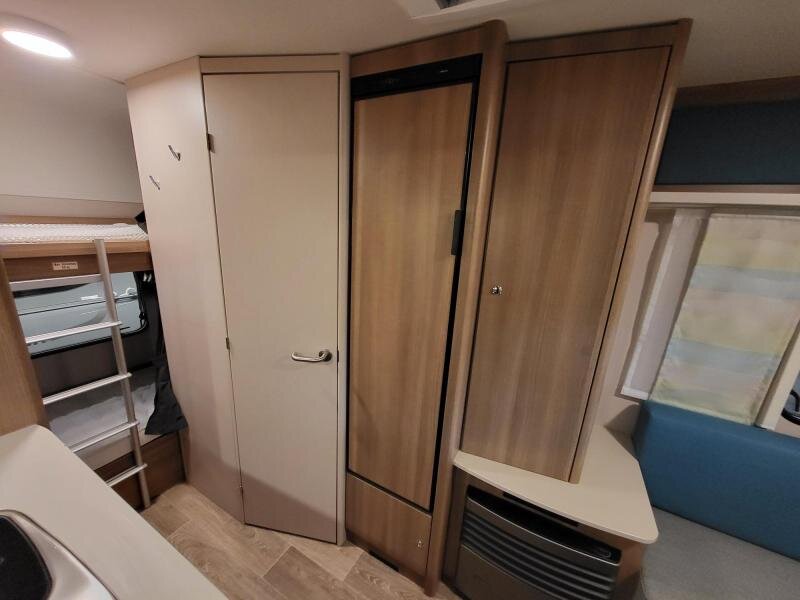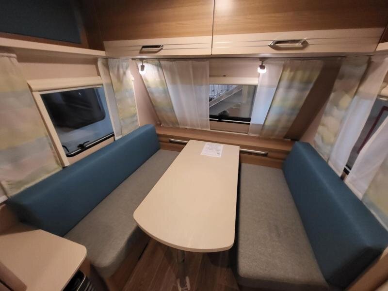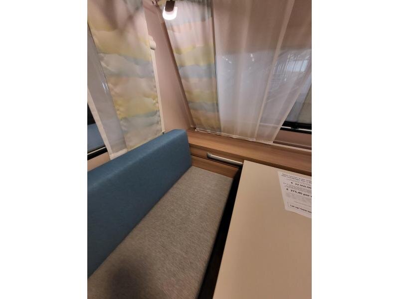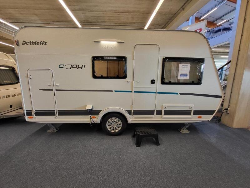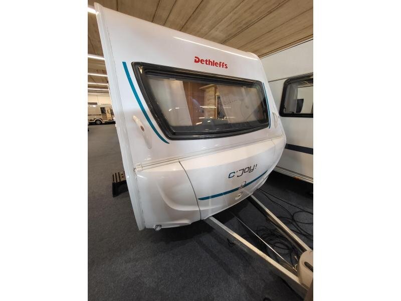 Een eigenlijk nog nieuwe Dethleffs C'joy 410 LK met ruime zit en stapelbed. De caravanis van bouwjaar 2022, kenteken 2023.
